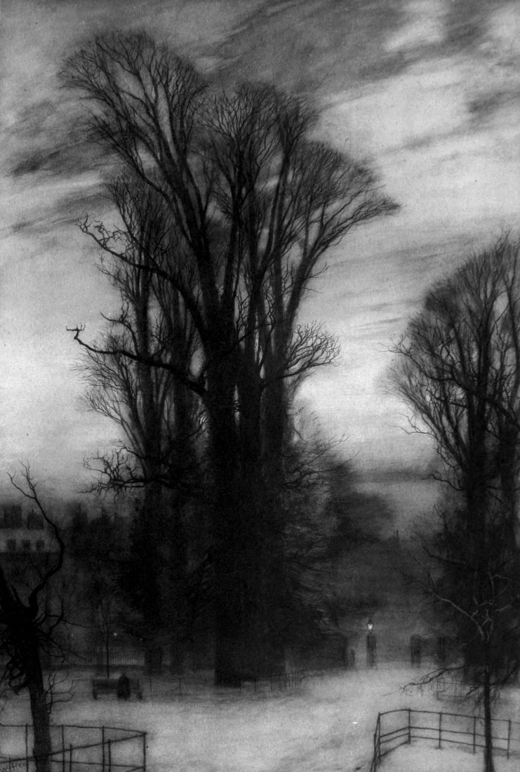 The sharp green of the plane-tree is never covered, nor are the delicately sprinkled spots of the poplar-leaves mingled and massed, in these solitary citizen trees. It is [Pg 13]in the avenues and glades of Kensington Gardens that Night has her way. There amends are made for the common day by a double mystery. Not a tree is so much as to be known by name; all kinds sigh together in the dark. The mass is sombre and alive, but betrays neither leaf nor colour. As violently as the spirit of the woods was driven away, through all the long daylight, by the sound, the breath, the blackness, and the stamp and seal of London, which permit nothing visible—not a blade of grass—to go unmarked by the proprietorship of this despotic city; so swiftly as the spirit of the woods was hooted and stared into banishment by day, so quickly, so intently, and in such a union of multitude does it softly return by night. Solitude comes, the movement of the forest comes, and remoteness, which by day must be sought where it abides, comes at a stride to London, and sits in the branches of the trees. Profound is the forest and august the sky whence the great and melancholy spirit of the woods comes to restore these daily altered elms.