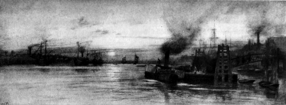 The first impression, and, needless to say, the longest, is that of the many miles of wharves compared with the few miles of embankments, drives, and of the holiday river generally. Not only have the black and brown warehouses, the chimneys, and the cranes possession of the whole right bank of the London Thames, but they hold both banks of the lower Thames through league-long reaches and noble curves, and such changes of aspect, sky, and direction as renew the scene by the rule of the sky.