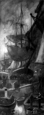 The dusky voyage darkens, for the Thames turns towards the north; anon it takes a pale grey splendour, the sky shines, and the delicate intricacy of masts that mar nothing of the simple view seems to be rather itself luminous than dark against the light; flying birds are lost as they pass in the upper brilliance. It is but that the Thames has swung towards the south again.