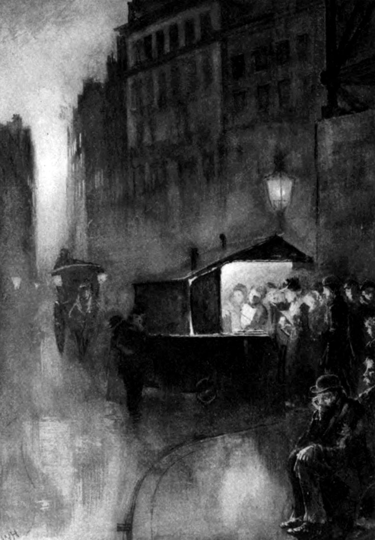 Add to this the black garments of the crowd, which make every man conspicuous in the light, and the abrupt and minute patches of white—exceedingly pure white of sharp shapes and angles—scattered throughout the drifting and intercrossing multitude. The white of a footman’s shirt, the white of the collars of innumerable men, the white letters of advertisements, the white of the label at the back of cabs and hansoms, and many and many another little square, triangle, and line of white, are visible to the utmost distances. They have an emphasis that is never softened; nothing,[Pg 7] except snow, could be whiter; and nothing, perhaps, makes so salient a part of the enormous fragmentariness of the street view.