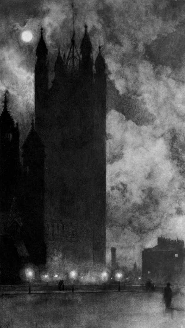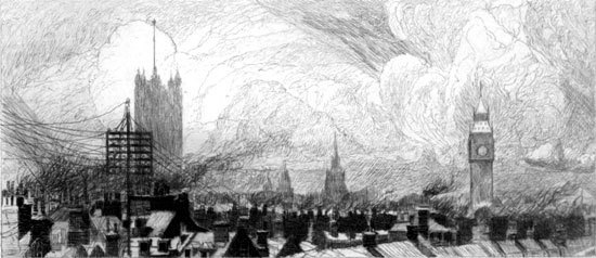 After this, let us grant the smoke the tragi-comedy of its successes. These are generally connected with Westminster; it finds matter fitted to its manner in the surrounding architecture, and in the westward opening. It suppresses a great deal that [Pg 11]is not very presentable, on the working side of the river, and it reveals what is Gothic on the other bank. It has a trick of being ashamed of its origin, for it hustles the long chimneys out of sight. It does really surprising things with the beautiful dome of St. Paul’s; the very formlessness of its presence seems to give more value to that fine form. It has a way of showing the noble tops of clouds while it loses their bases in vagueness, which is not without beauty. You cannot see from what heavenly ranges of highlands those summits tower, and if they stand into the sunshine their isolation is the more remote and splendid. But even this is but a handy bit of scene-shifting; it touches no more than the fancy.