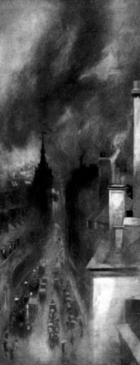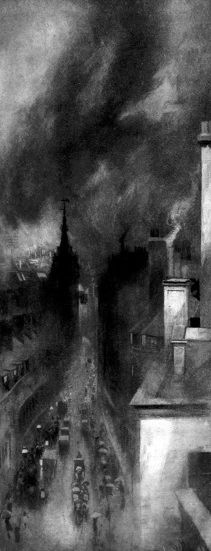 When the Great Fire of London came out of its hiding-places and took life in the[Pg 31] air of day, it made ashes of more evident and conspicuous things, but it can hardly have made more ashes and cinders than it makes daily under cover. London is not destroyed again, but it has become the place of immeasurable destruction. Moreover, since the smouldering city is a city of men, the life of men, so multiplied, makes London a very centre of fires insatiable. That life burns within five millions of furnaces. Life feeds itself by fire, but out of London we are accustomed to see it at its consuming work side by side with the signs of unceasing re-creation. Man, woman, and child, sprinkled over the labouring land, are separate flames far apart like the marsh flames of wildfire. Between them graze the sheep, the wheat turns brown, or the apple reddens, and the husbandman’s life itself is immediately paid again in labour to the soil. Whereas London visibly works at nothing but transformation.